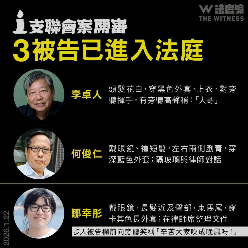 支聯會被指煽動顛覆案周四(22 日)早上在西九龍裁判法院(暫代高院)開審,何俊仁認罪,李卓人、鄒幸彤不認罪。庭上所見,李卓人頭髮花白、何俊仁短髮,長髮及臀部的鄒幸彤步入被告欄前向旁聽笑稱「辛苦大家吹成晚風呀!」。