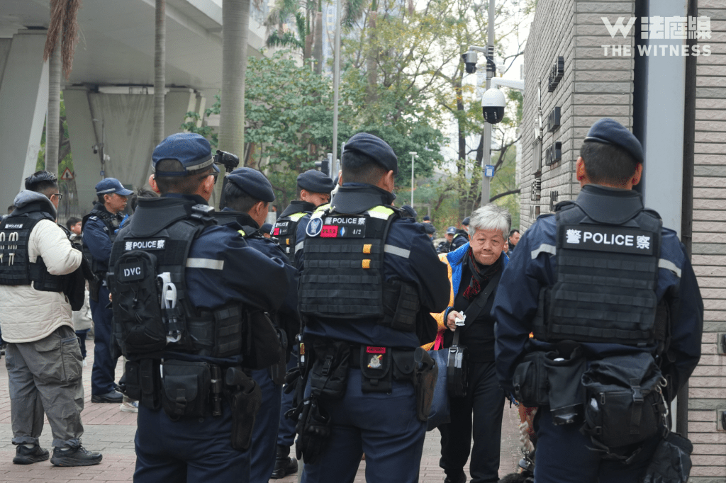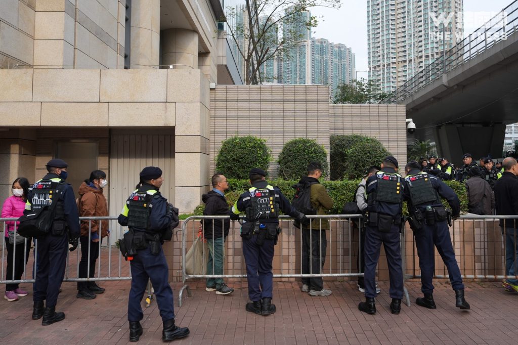 警方大約早上 8 時在法院門外設置鐵馬,排隊公眾其後陸續進入法院。警員檢查每個人的隨身物品才放行。