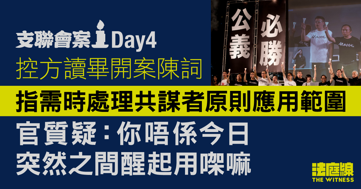 支聯會被指煽動顛覆案周二(27 日)踏入第四天審訊,控方讀開案陳詞期間,在庭上確認擬引「共謀者原則」舉證以起訴被告,包括支聯會一方的辯方代表質疑事前未提,要求交代細節。控方稱「時間緊逼」仍需時處理,被法官質疑案件已一再延後,「你唔係今日突然之間醒起用㗎嘛」。官押後周四續審,以待控辯商議。