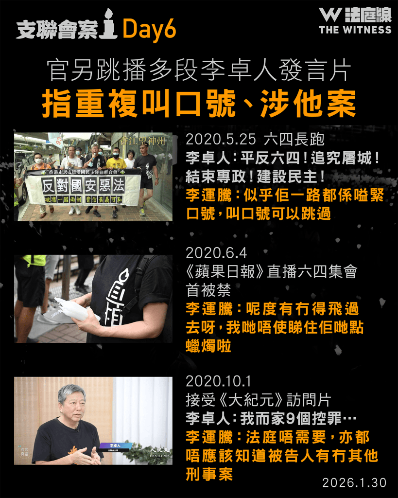 支聯會被指煽顛案周五(30 日)踏入第六天審訊,控方再播 20 條片段證據,法官李運騰指示跳播或停播當中 9 條。就李卓人出席美國聽證會片段,官指李的發言或涉勾結外力罪,要求跳播,而李在另一片段提及身負另案,官則指法庭毋須知悉(詳見內文圖)。