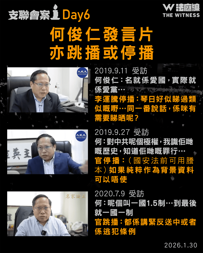 控方播放的 20 條涉案片段,橫跨被告在《國安法》實施前後的發言或訪問,包括何俊仁和李卓人多次稱仍會堅持支聯會五大綱領之一的「結束一黨專政」。法官在播放其中 9 條片段時,以內容重複、與案無關等理由,指示控方跳播或停播部分內容。