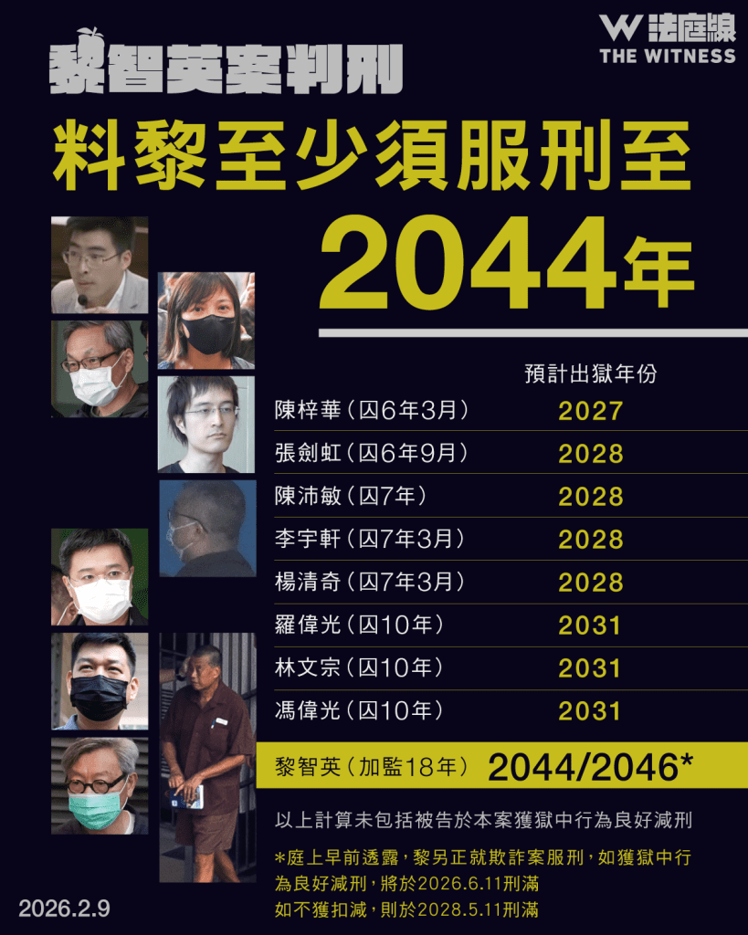 至於正就欺詐案服刑的黎智英,法庭向他加監 18 年。辯方早前在求情時透露,如黎在欺詐案獲三分一獄中行為良好減刑,將於 2026 年 6 月 11 日刑滿,若不獲行為良好扣減,料於 2028 年 5 月 11 日刑滿。《法庭線》以此為基礎,預料黎至少須服刑至 2044 年,或最長至 2046 年。