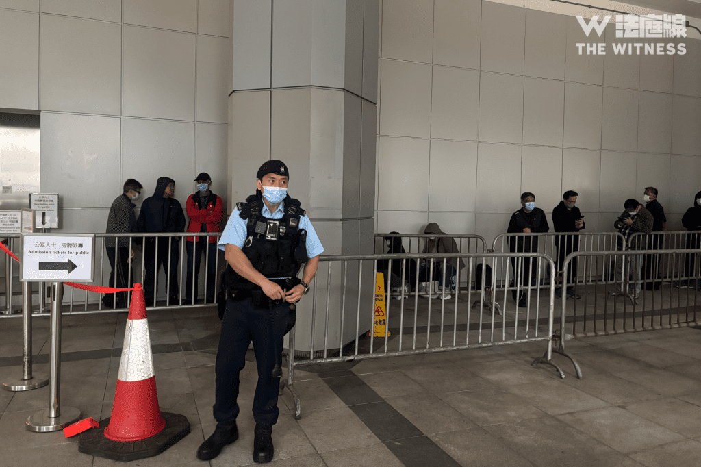記者早上所見,高等法院外有約 30 人輪候旁聽籌,人數與周三相若,近 20 名警員在現場駐守,包括通往力寶中心的天橋。有警員向記者表示,如要採訪須邀請該人離隊前往數米外的採訪區。早上 8 時,法庭保安派發公眾籌,亦有傳媒等候囚車駛入。