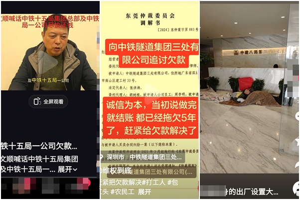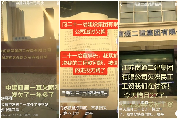 讨薪网友在网上发图。@寤寐:中建四局一直欠薪不发,欠了一年多了。@维权在路上:向二十一冶建设集团有限公司追讨欠款。我们必将坚持到底,不拿回欠款,绝不止步!@英晗牵挂:江苏南通二建集团有限公司欠农民工工资,我们在讨薪!今天是腊月27了,希望领导支付工资。