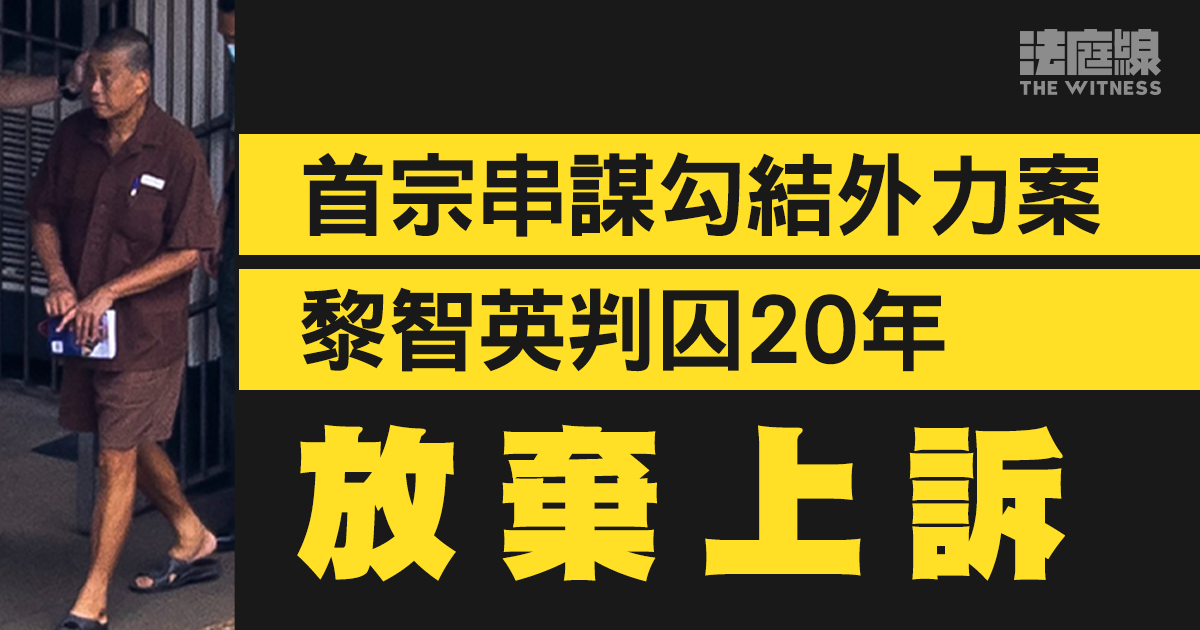 壹傳媒創辦人黎智英,被裁定串謀勾結外力、煽動 3 罪成,上月被判囚 20 年,為《國安法》生效以來刑期最重被告。他的香港律師團隊周五(6 日)向《法庭線》確認,已收到清晰及明確指示,黎智英不會就定罪或刑罰提出上訴。