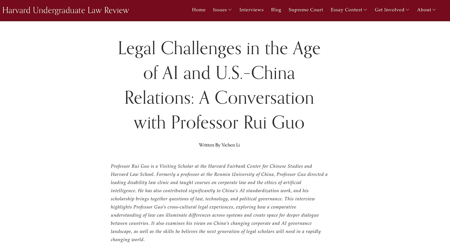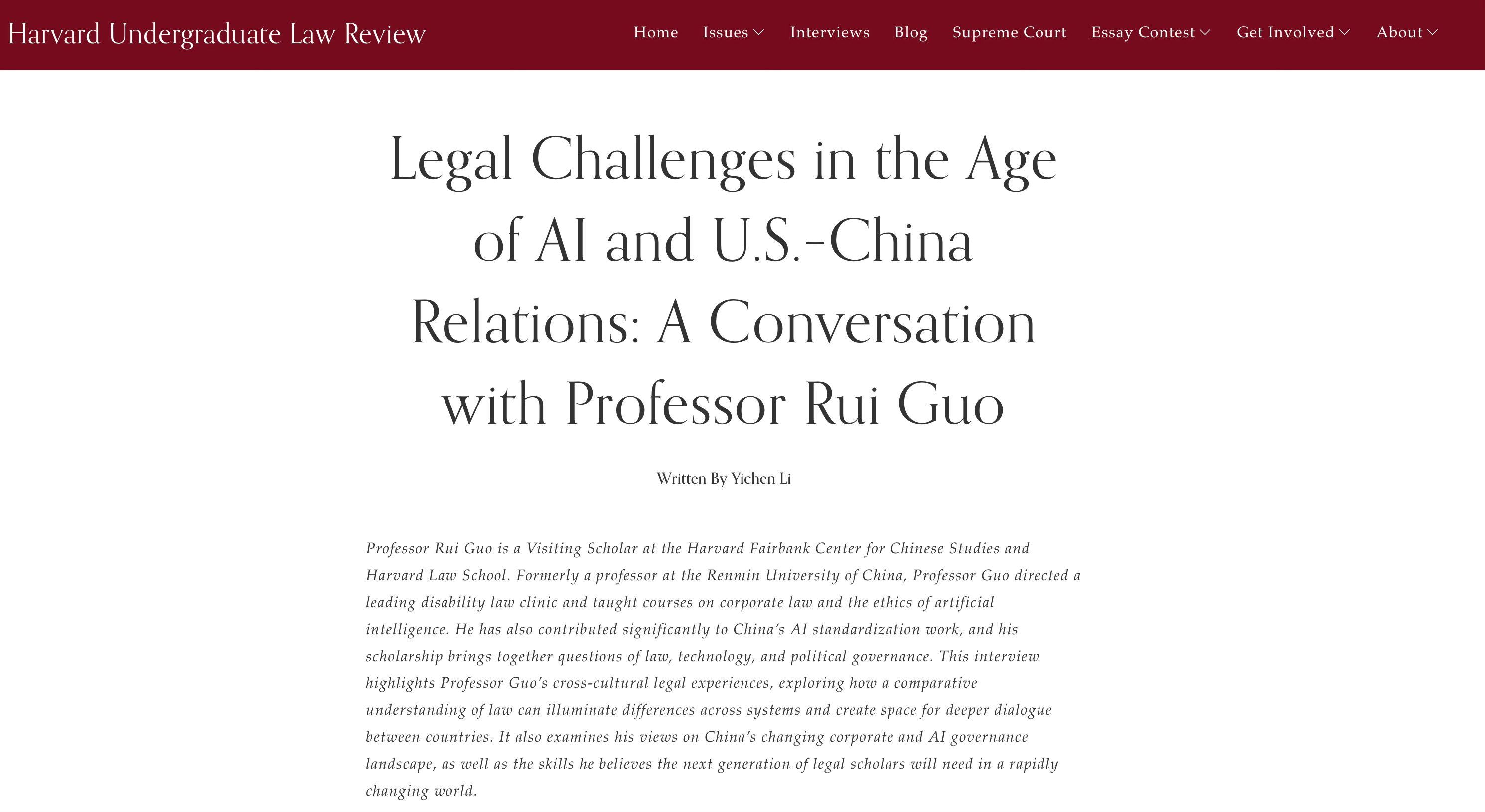 编者按:2025年12月份,《哈佛法律本科评论》(Harvard Undergraduate Law Review,HULR)就人工智能时代法学面对的挑战,刊发了哈佛大学本科生李宜宸对哈佛法学博士、法学学者郭锐的访谈Legal Challenges in the Age of AI and U.S.–China Relations: A Conversation with Professor Rui Guo。《哈佛法律本科评论》与作者授权刊发,并由作者李宜宸翻译成中文。