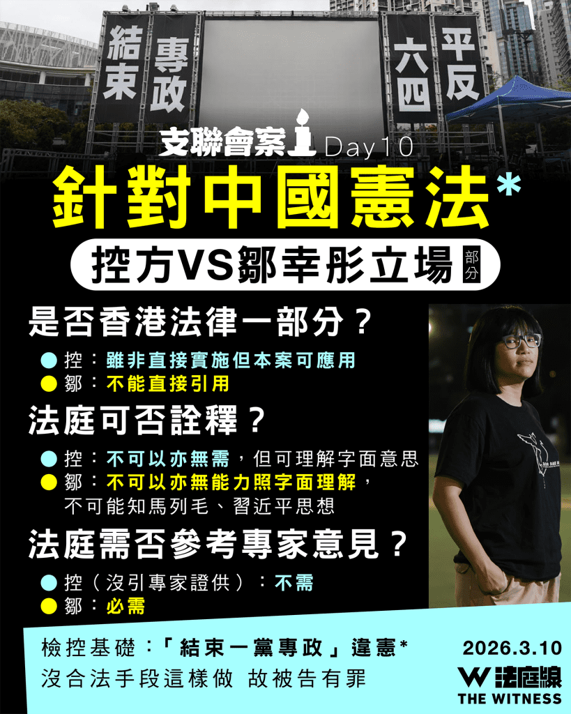 支聯會被指煽顛案周二(10 日)踏入第十天審訊,自辯的鄒幸彤作毋須答辯陳詞,爭議圍繞香港法庭能否及如何應用中國憲法。鄒主張,憲法不能直接應用在香港,法庭沒權詮釋,亦必需依賴專家證供理解,她又質疑,控方指被告違憲並不能直接構成「非法手段」的基礎(見內文圖)。