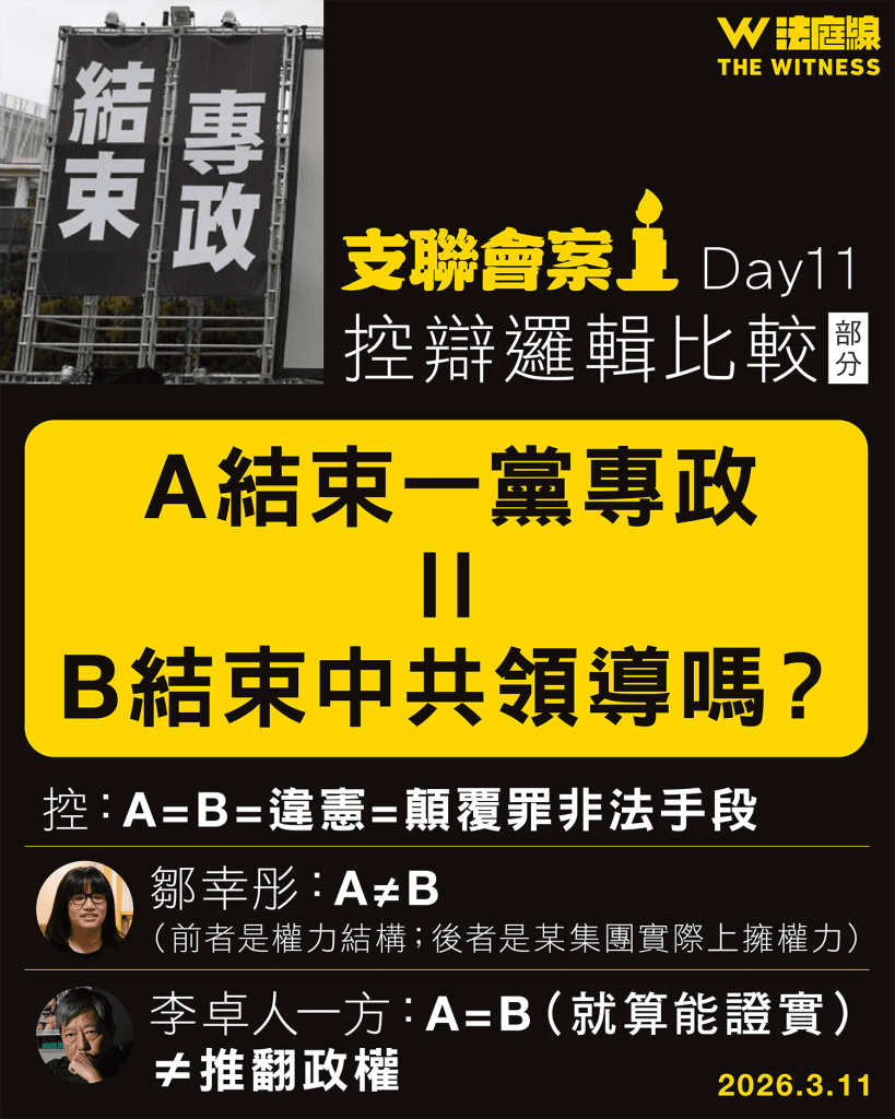 鄒幸彤則指,支聯會主張「結束一黨專政」是要「民主轉型」,很難不致修憲,亦不認同此綱領等於「結束中共領導」。鄒並反問,即使順着控方案情,要求結束中共領導「點解唔可以呢?」指法律必然有合法途徑改變,亦必須保障辯論憲法的自由。